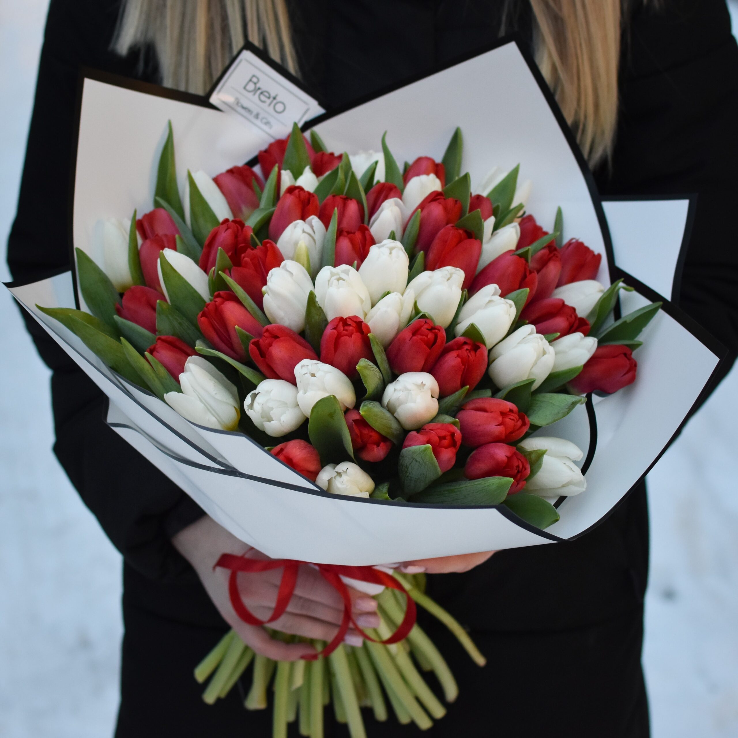 Baltų ir raudonų tulpių kontrastas lygiai taip pat kaip ir rožių – atrodo ne tik romantiškai, originaliai bet ir skoningai. Šių spalvų tulpes galite dovanoti moterims ir merginoms bet kokia proga, tačiau labiausiai tinka Valentino dienos proga ar moters dienos proga.