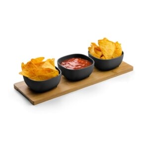 Rinkinį sudaro: bambukinė lenta ir trys, iš bambuko pluošto pagaminti dubenėliai. Bambuko pluoštas užtikrina indų ilgaamžiškumą ir atsparumą aplinkos poveikiui. Tinka plauti indaplovėje.