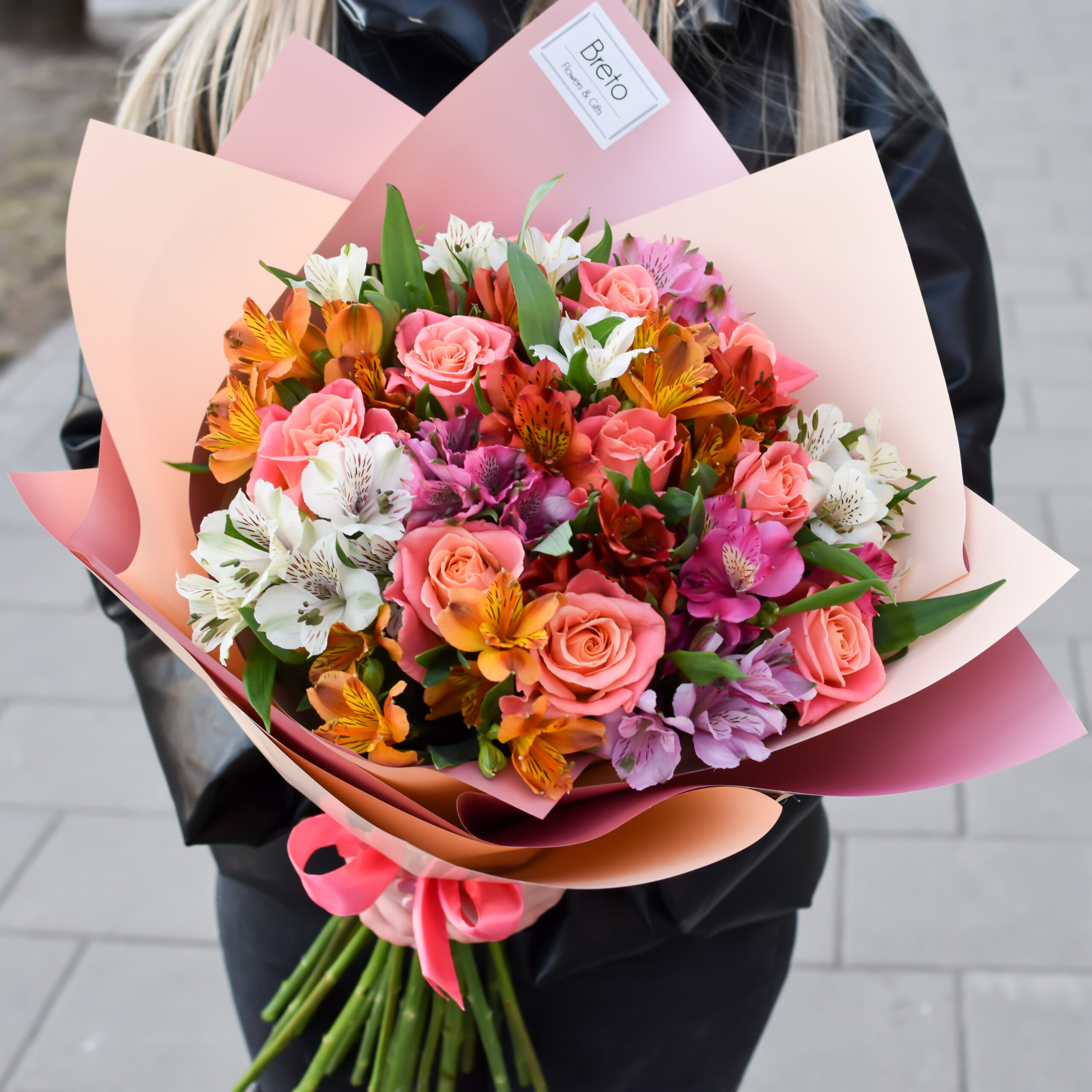 Koralinės rožės su alstromerijomis (alstromerijų spalva parenkama atsitiktinai) sudaro puikų vaizdą, nes rožės – elegantiškos gėlės, o alstromerijos yra vasariškos ir žaismingos, tad sudėjus jas kartu vaizdas puikus – prabangu ir žaisminga, vasariška ir spalvinga.