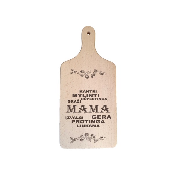 Pjaustymo lentelė iš kokybiško medžio su išgraviruotais apibūdinimais apie mamą: kantri, mylinti, rūpestinga, graži, įžvalgi, gera, protinga, linksma. Nustebinkite savo mylimas mamas!