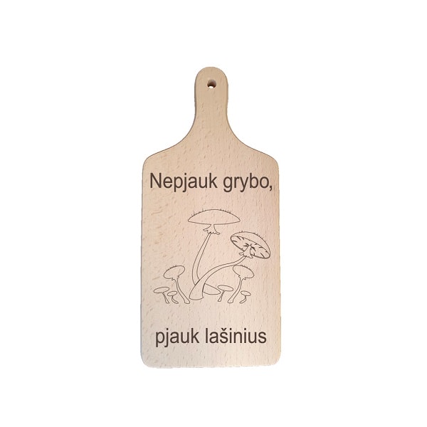 Nežinote kaip simboliškai pasveikinti artimuosius, draugus ar kolegas įkurtuvių proga? Ši šmaikšti pjaustymo lentelė „Nepjauk grybo, pjauk lašinius“ bus puiki ir nuotaikinga dovana tiems, kurie turi gerą humoro jausmą. Lentelė pasitarnaus tiek virtuvėje, tiek papuošiant bendrą virtuvės interjerą.