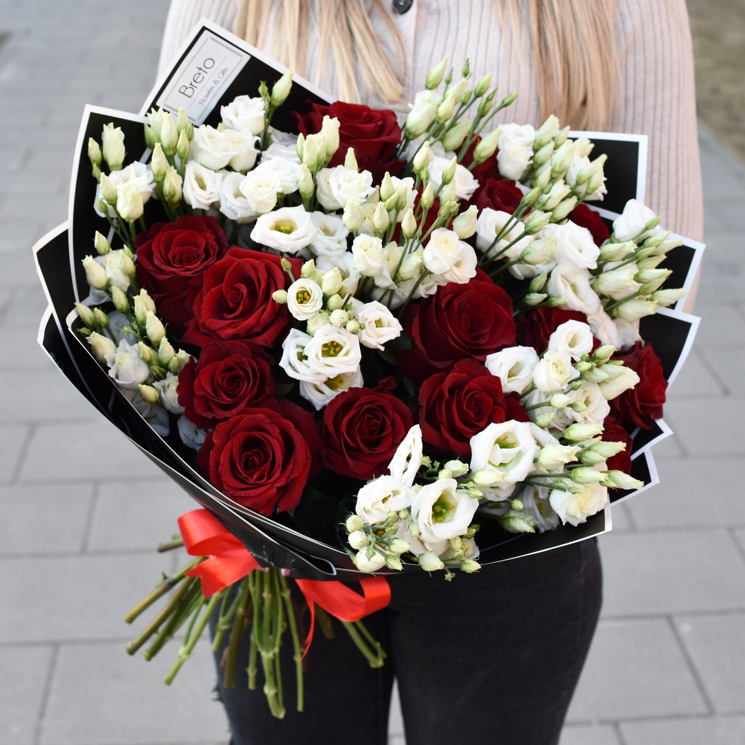 Raudonos rožės – pačios populiariausios ir labiausiai mylimos gėlės, o eustomos prabangą ir eleganciją asocijuojančios gėlės, tad ši raudonų rožių ir eustomų puokštė sužavės ir nepaliks abejingos nei vienos gavėjos.