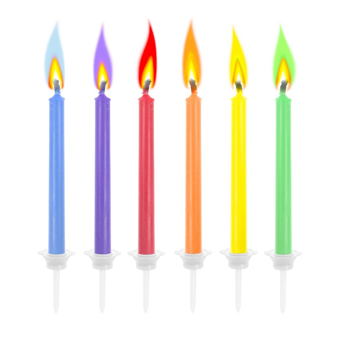Ieškai smagaus ir netradicinio elemento gimtadieniui? Šios spalvotos liepsnos gimtadienio žvakutės tikrai nustebins svečius! Kai jos uždegtos, ugnis pasirodo netikėtose spalvose — raudona, mėlyna, žalia, violetinė, geltona ir rožinė.
