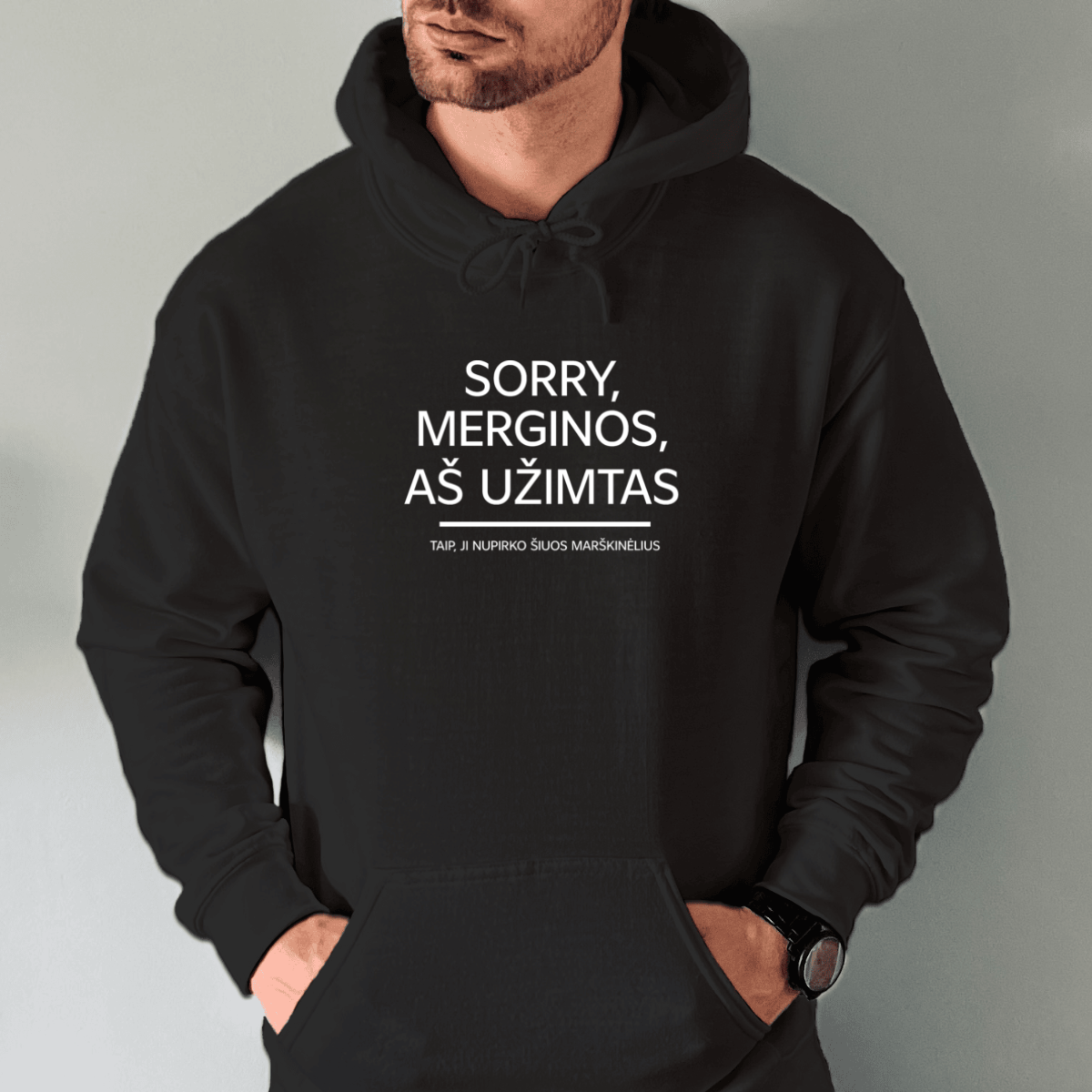 • juoda-unisex-dzemperis-su-spauda-sorry-merginos-as-uzimtas