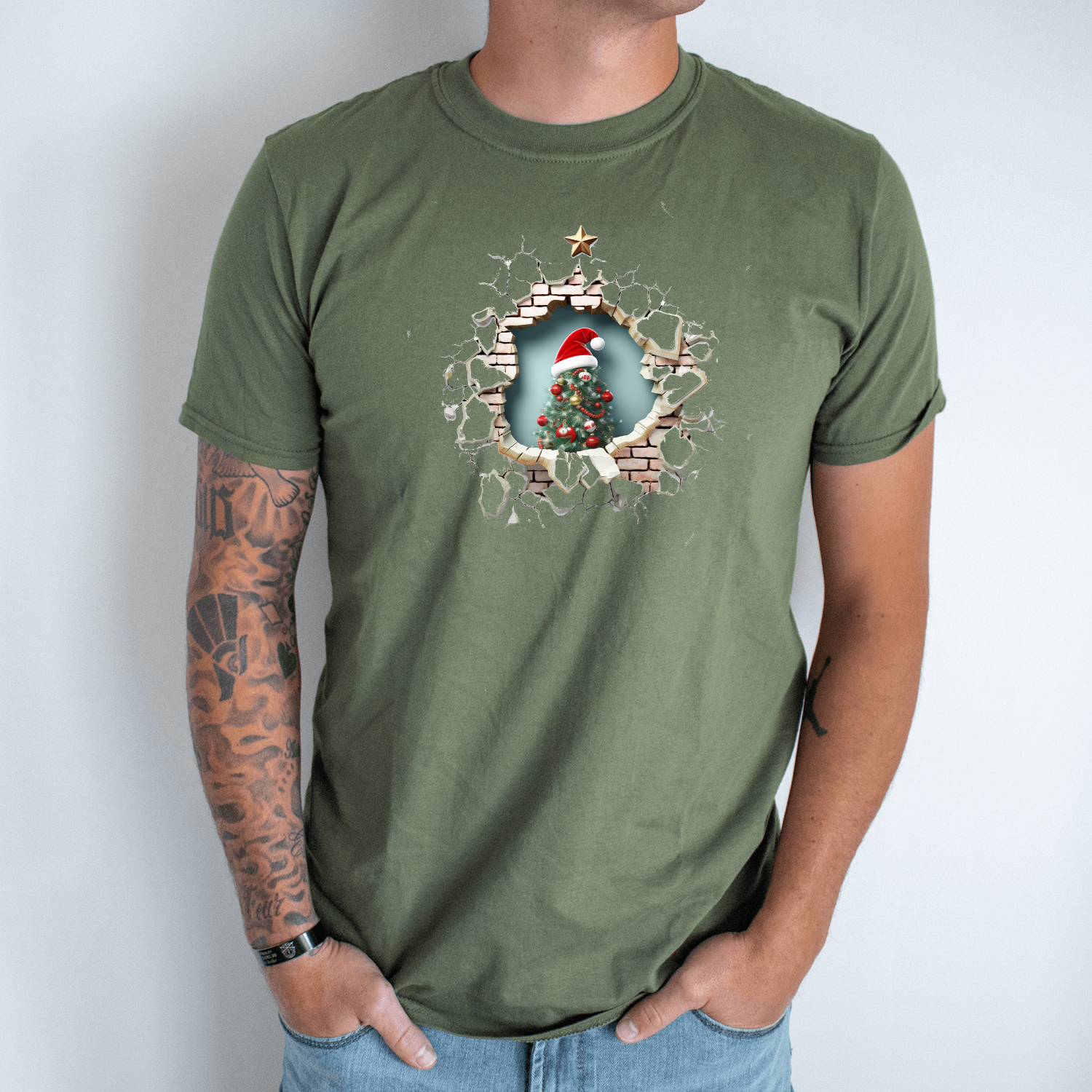 Unisex marškinėliai su spauda „Kalėdinė eglutė su kepure“
