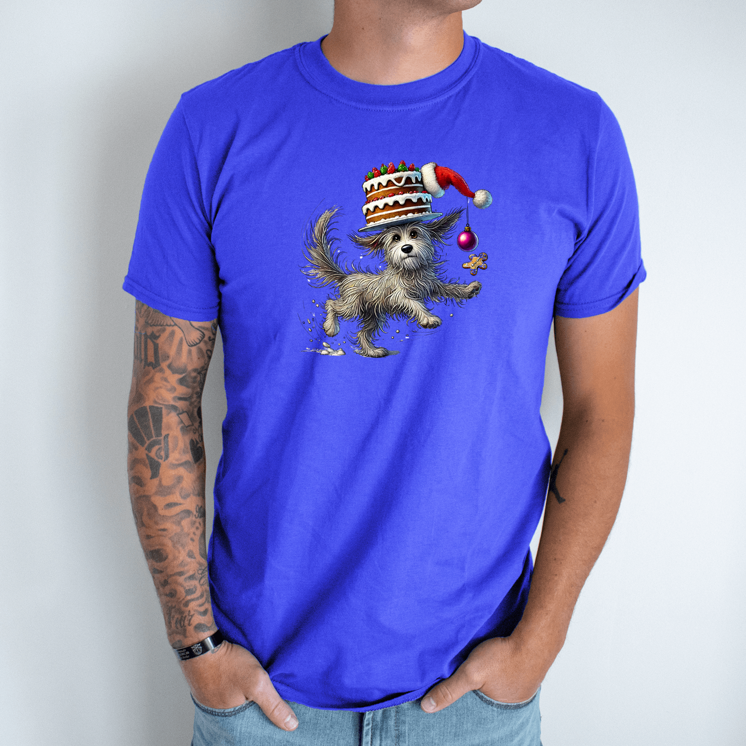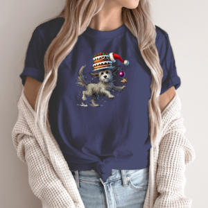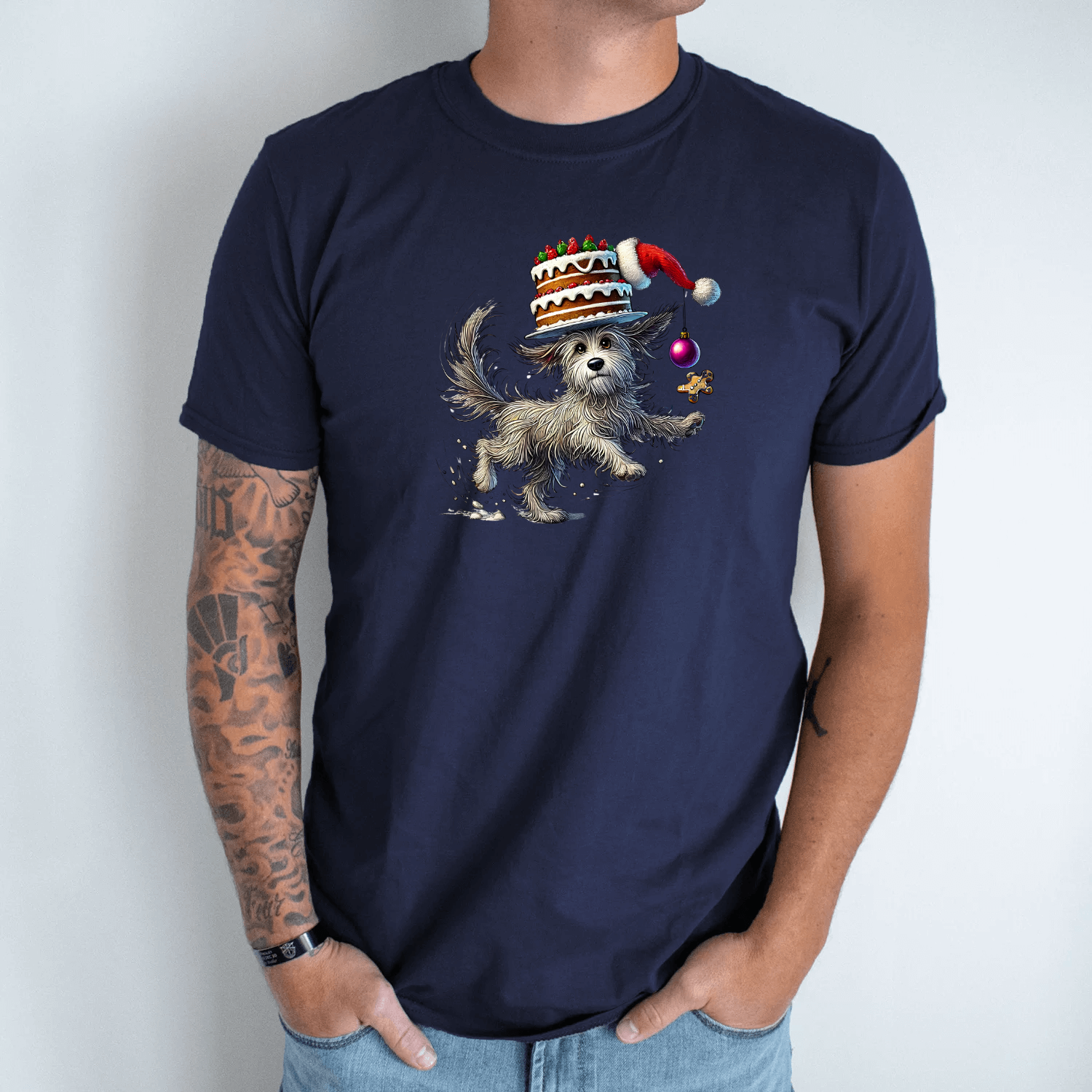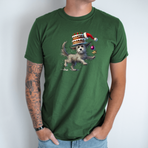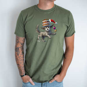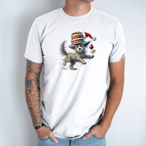 Unisex marškinėliai su spauda „Šuniukas su Kalėdiniu tortu“