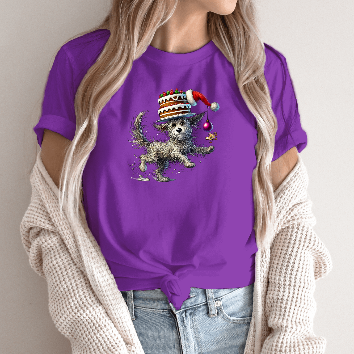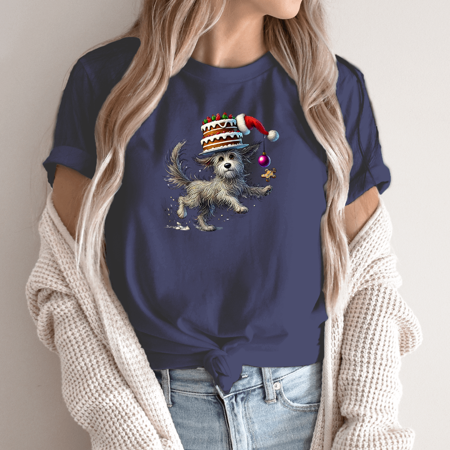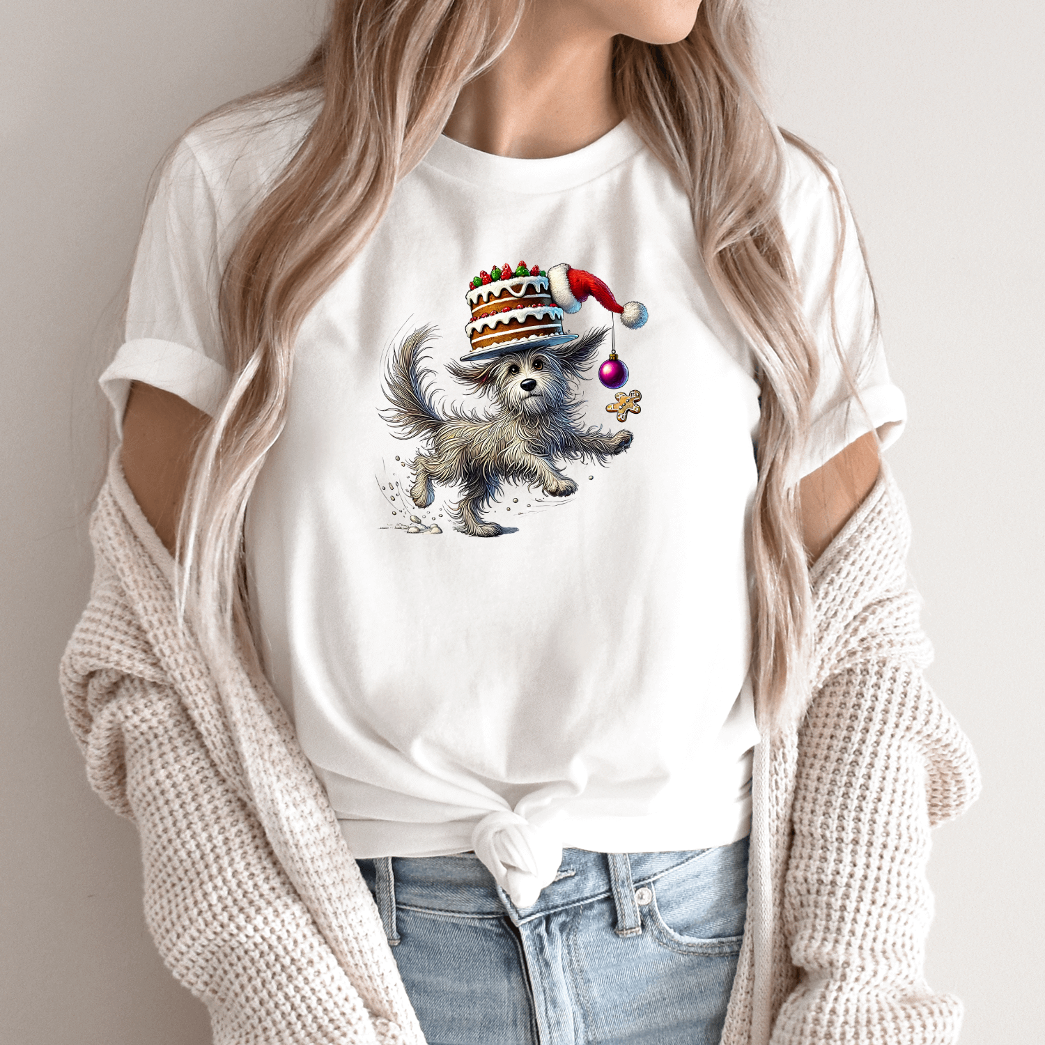 Unisex marškinėliai su spauda „Šuniukas su Kalėdiniu tortu“