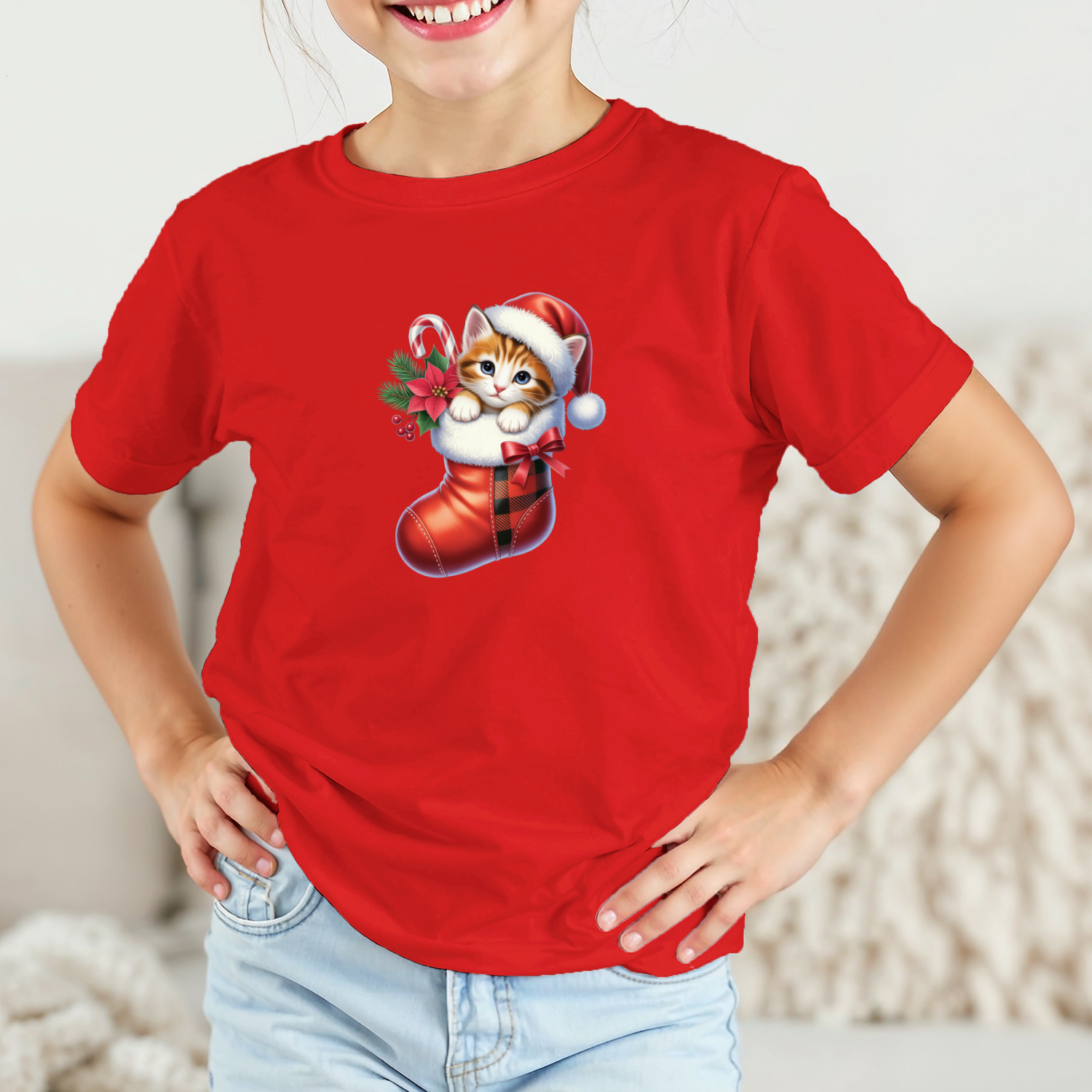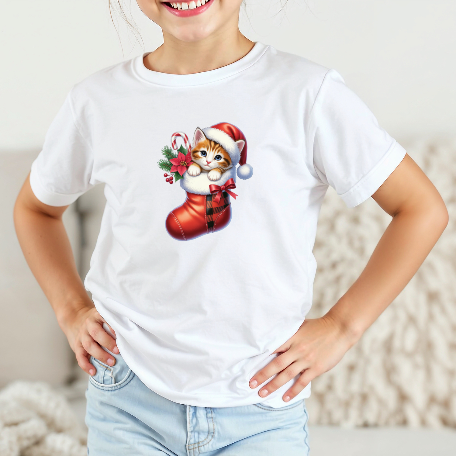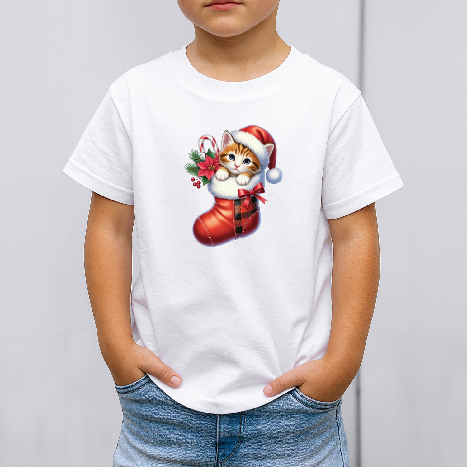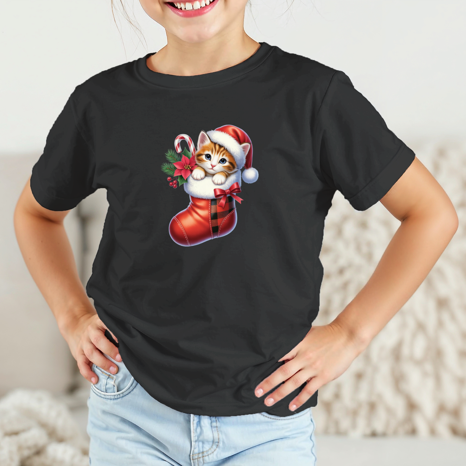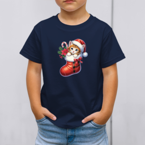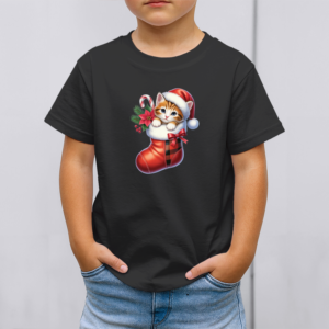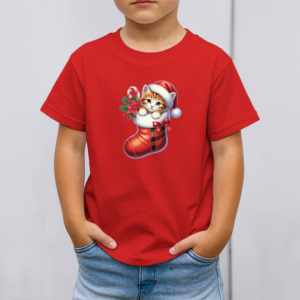 Vaikiški marškinėliai su spauda „Kačiukas Kalėdų kojinėje“