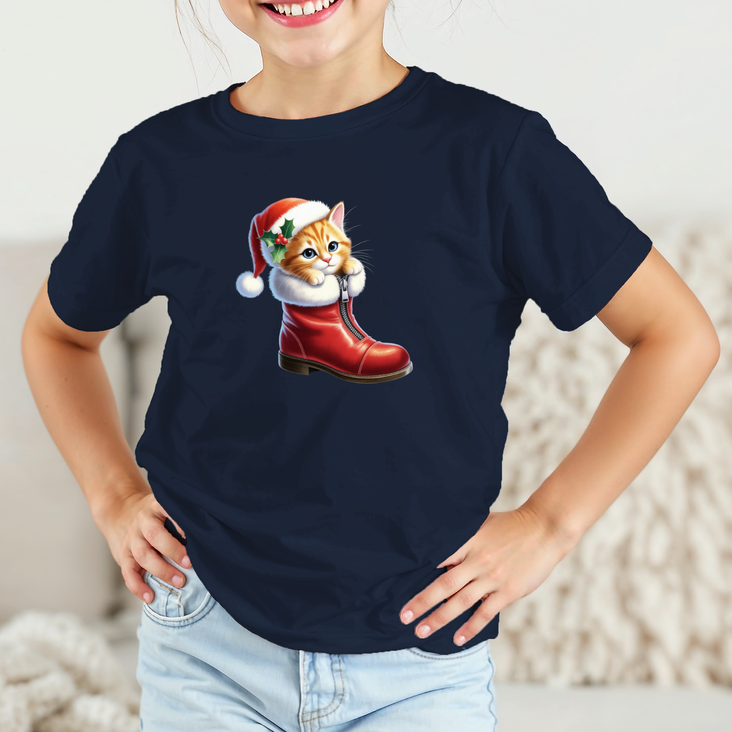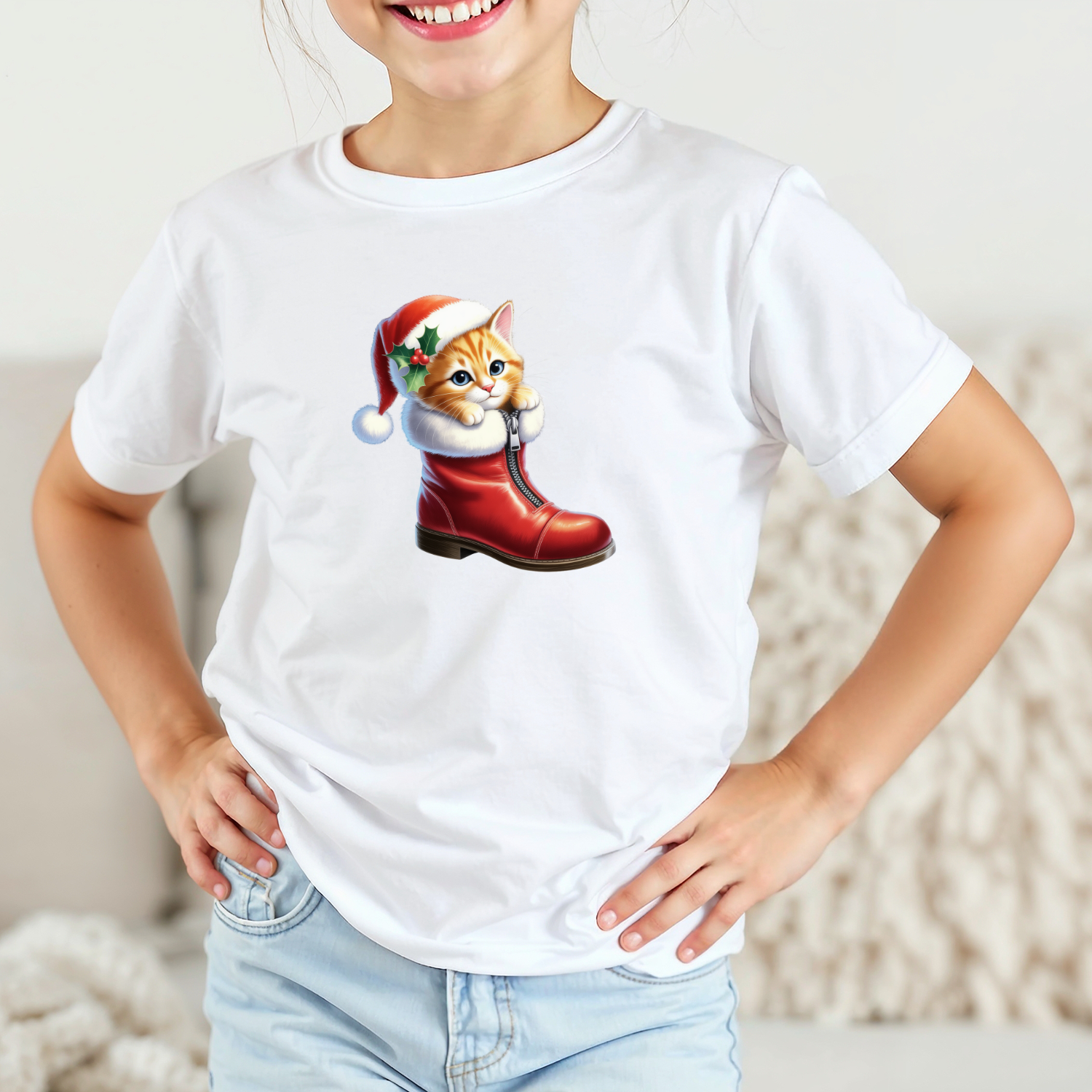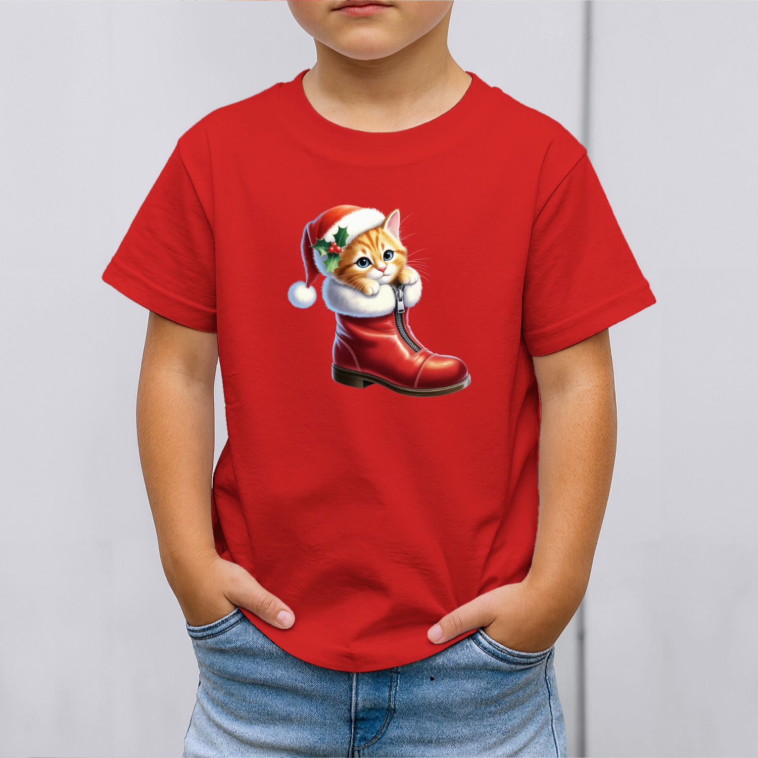 Vaikiški marškinėliai su spauda „Kalėdinis batukas su kačiuku“