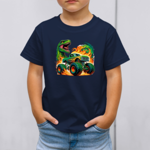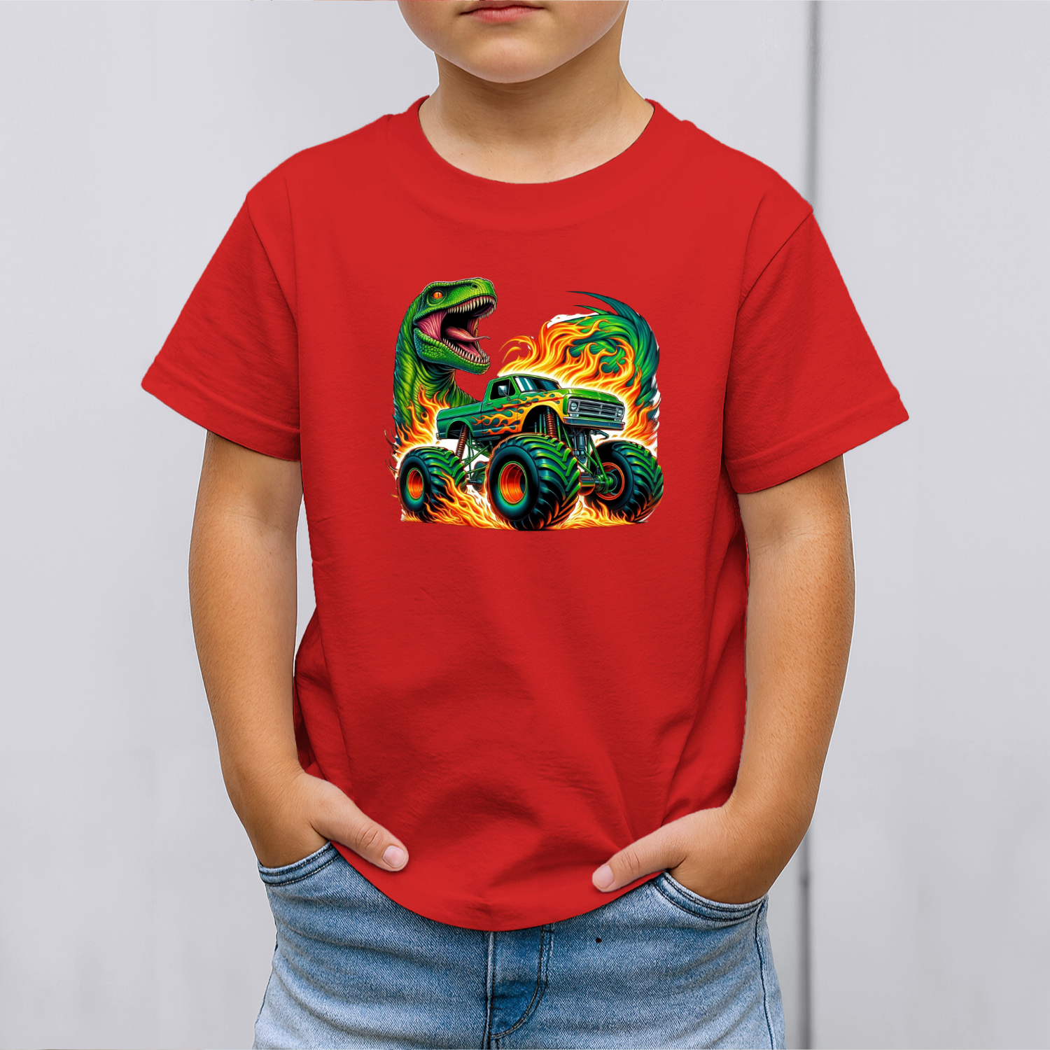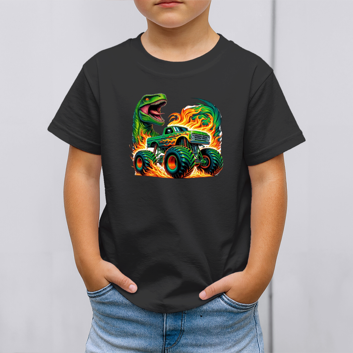 Vaikiški marškinėliai su spauda „Monster truck su dinozauru“