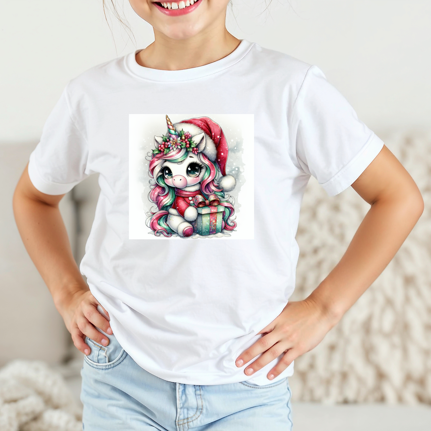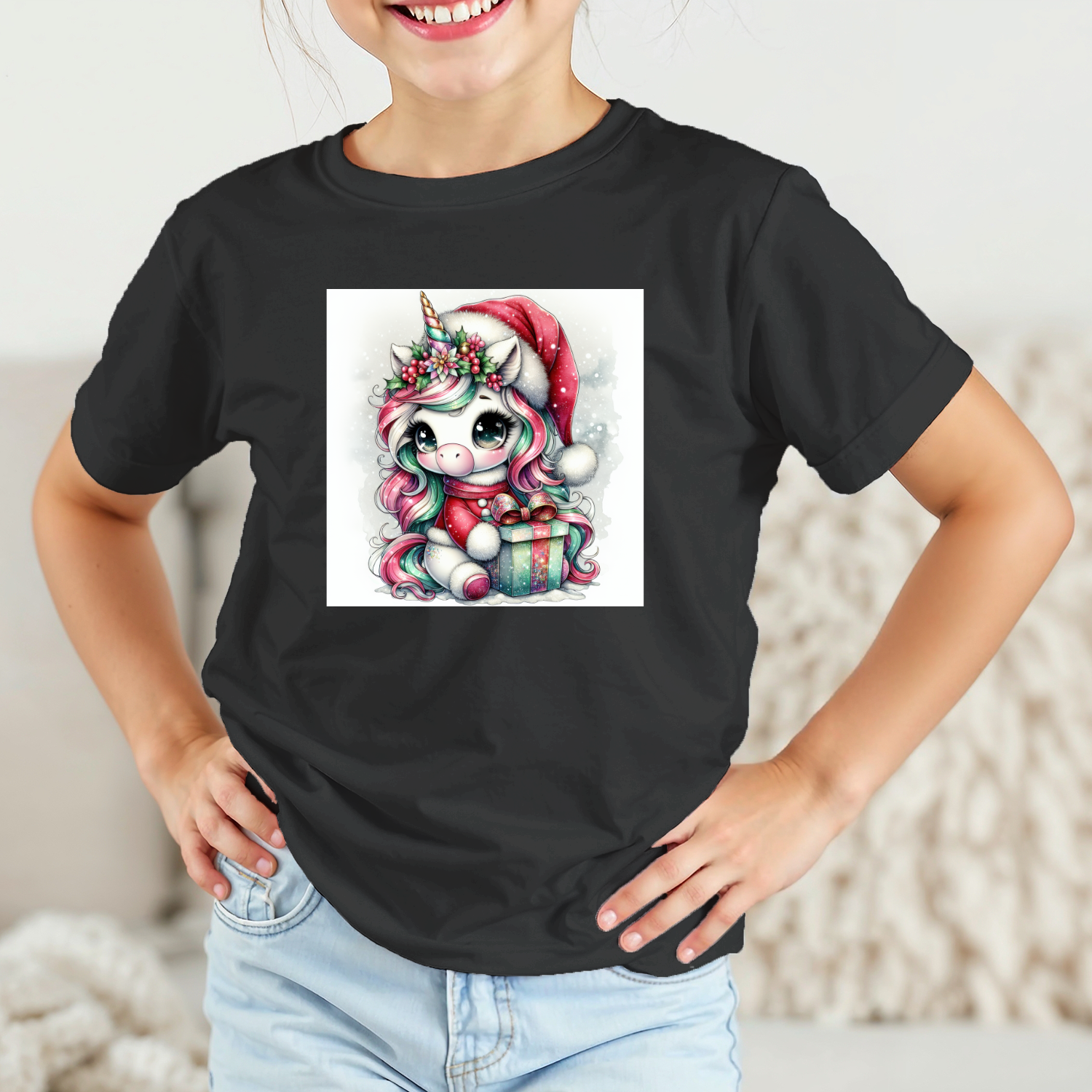 Vaikiški marškinėliai su spauda „Vienaragis su Kalėdine dovana“