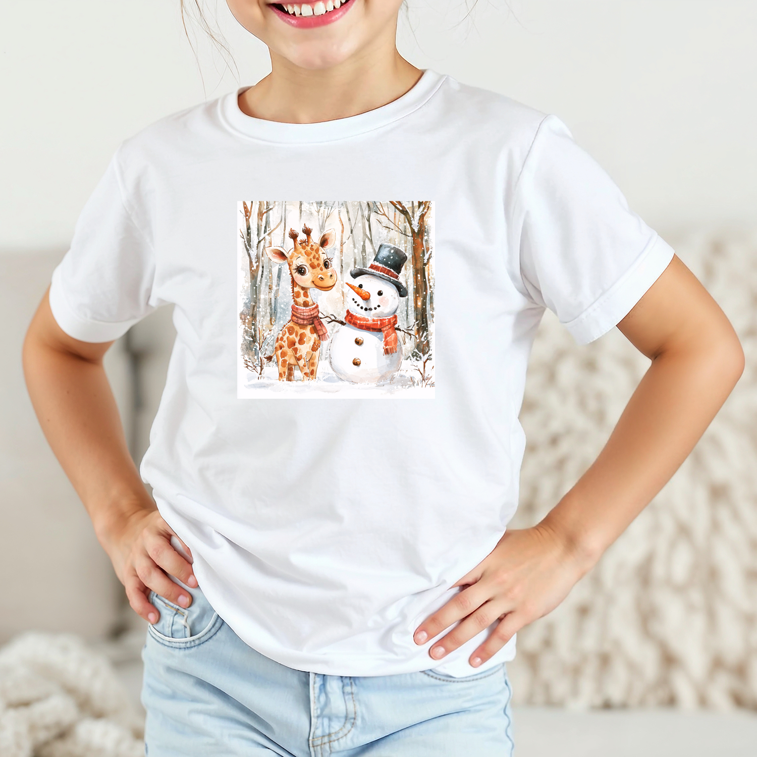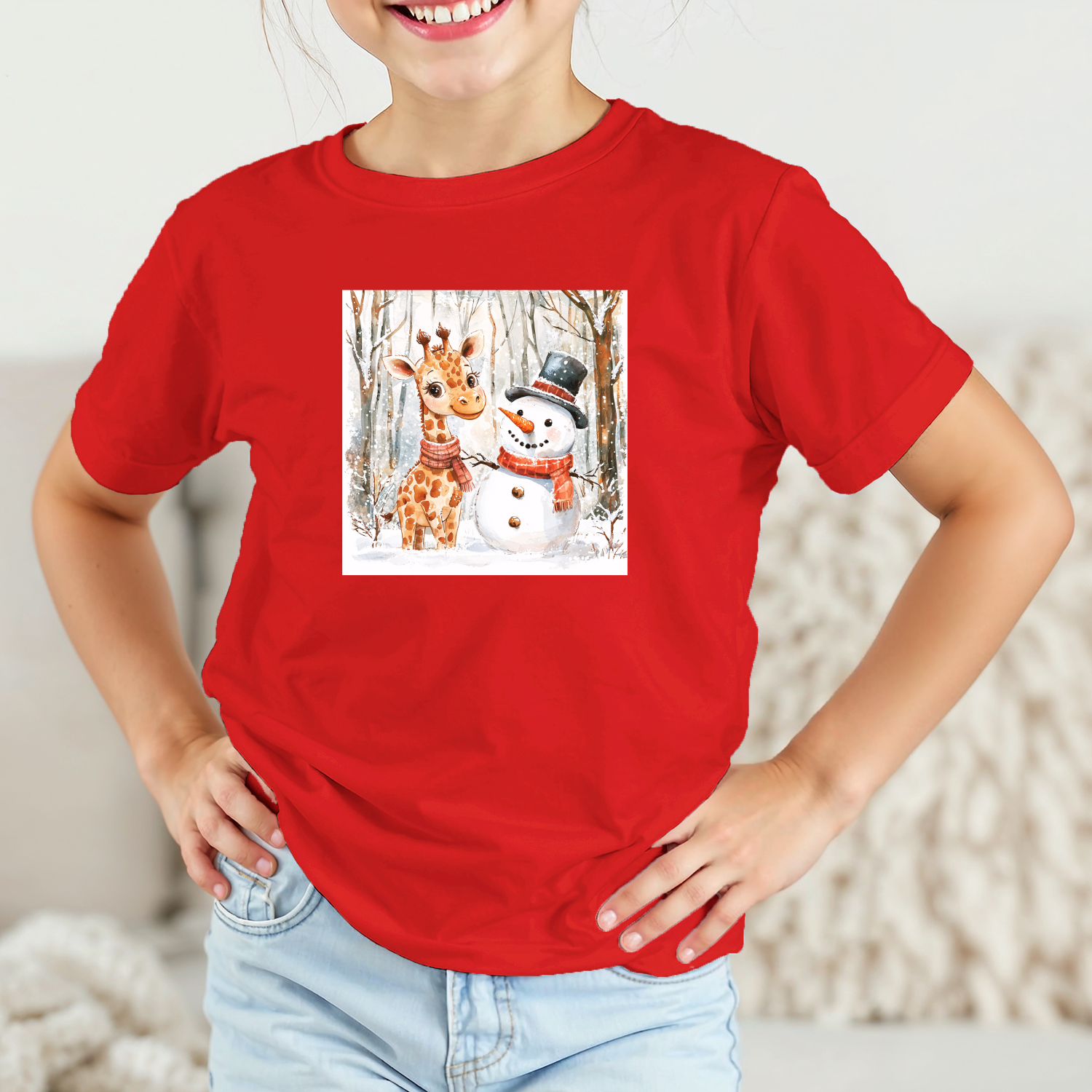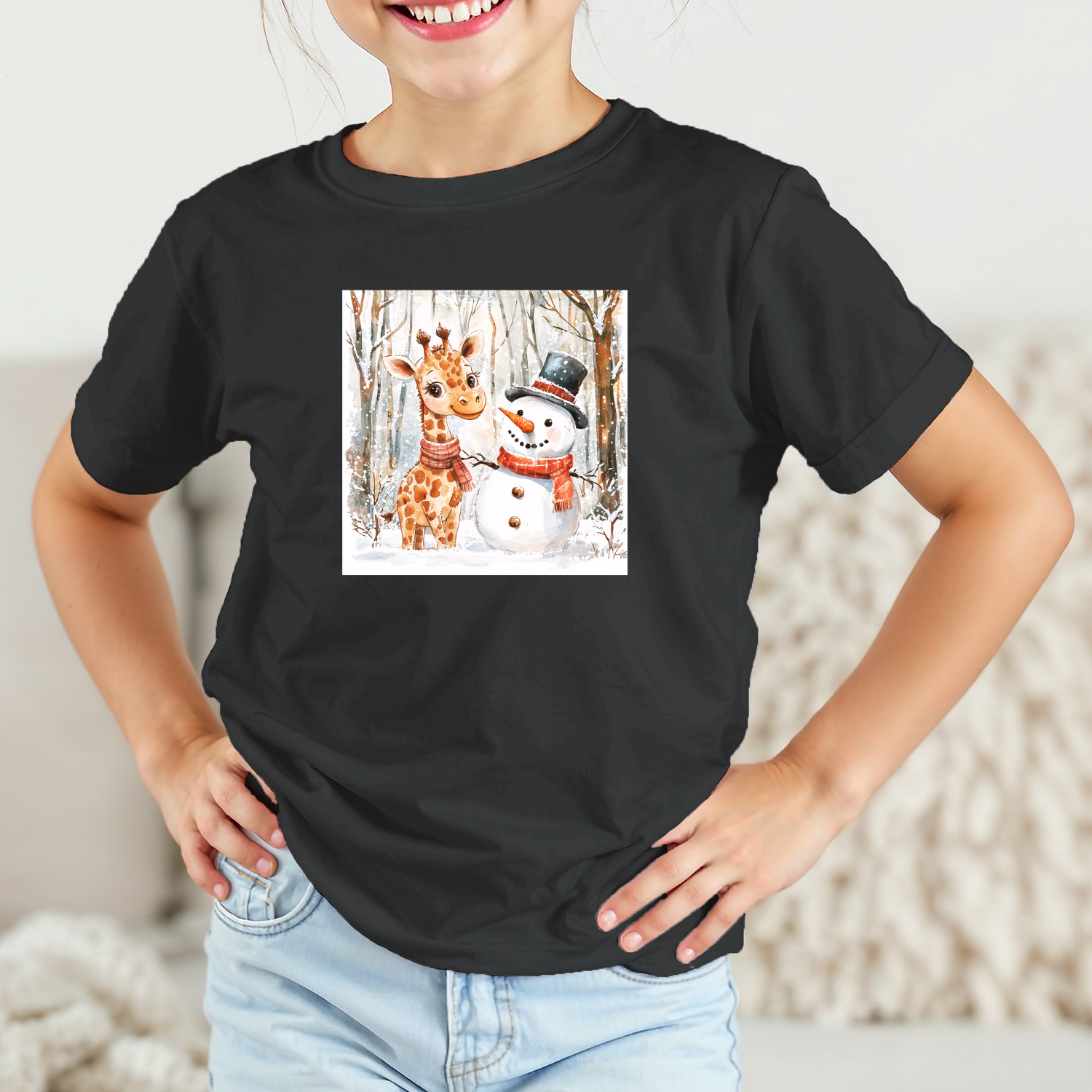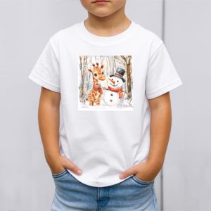 Vaikiški marškinėliai su spauda „Žirafos ir sniego senio draugystė“