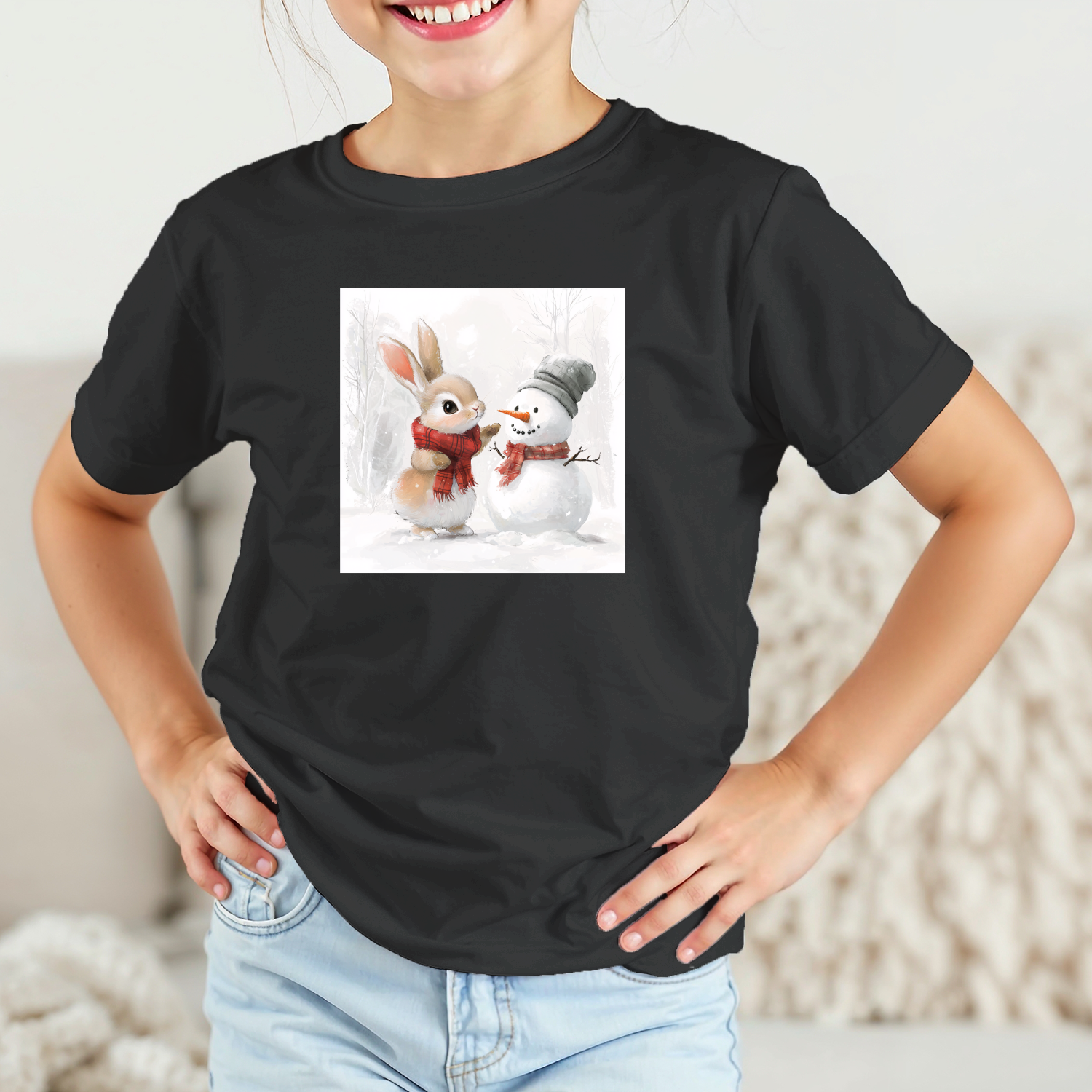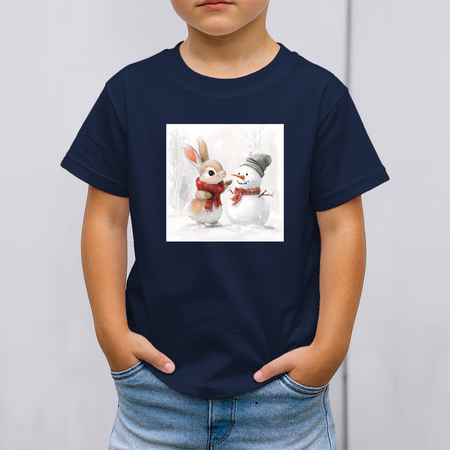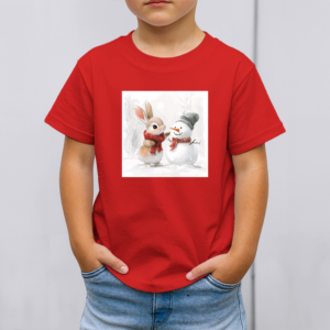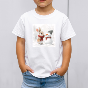 Vaikiški marškinėliai su spauda „Zuikučio ir sniego senio šilta akimirka“