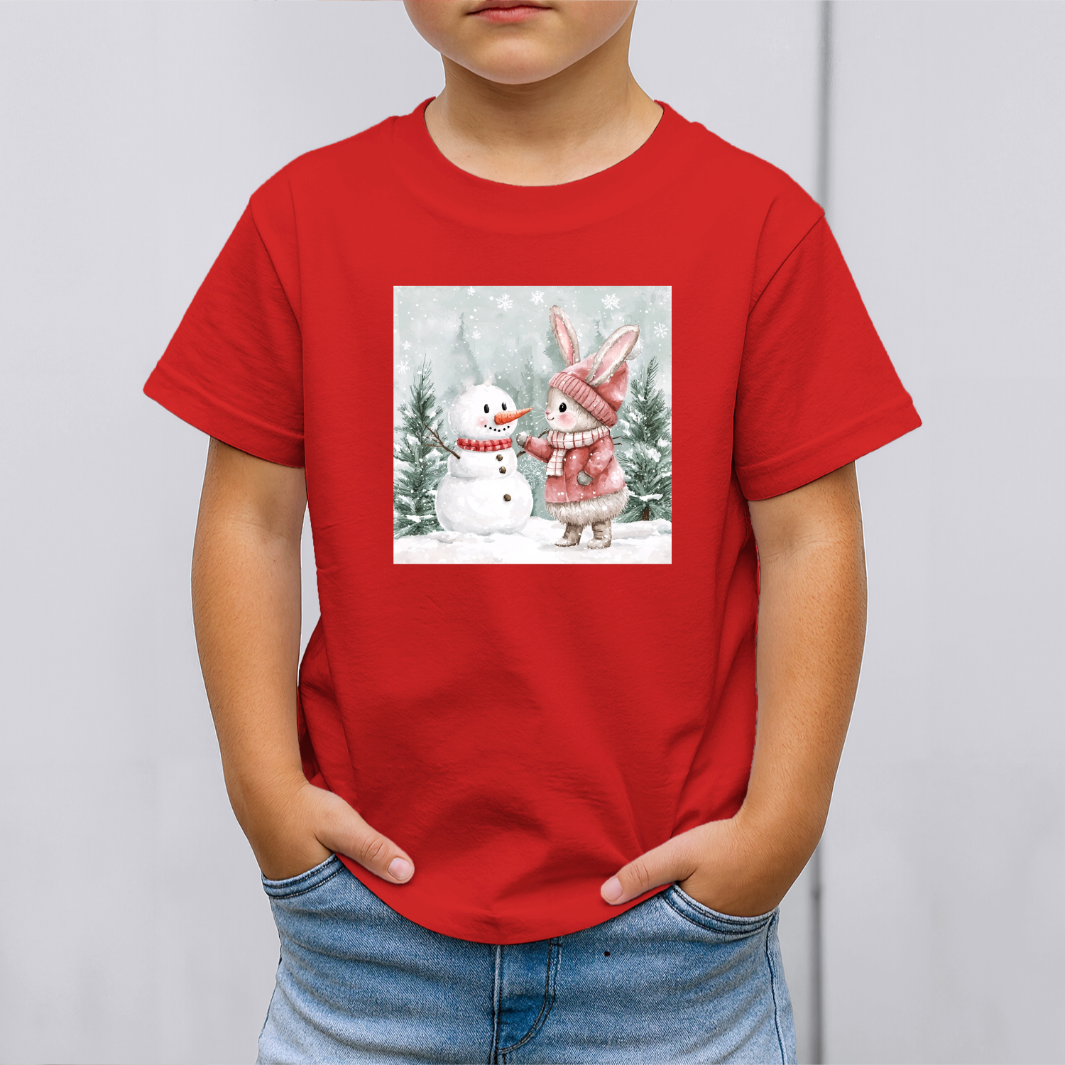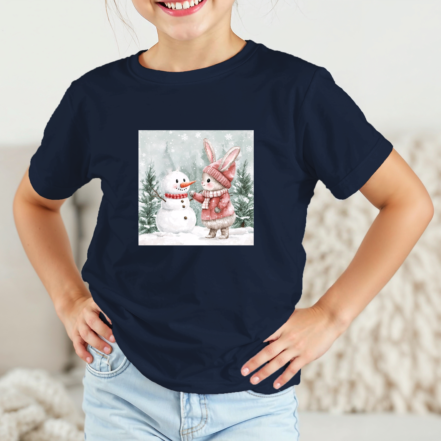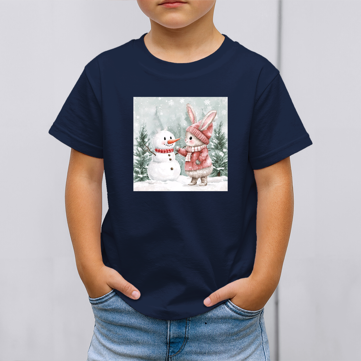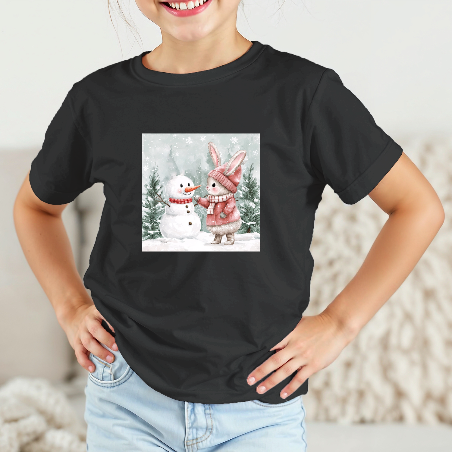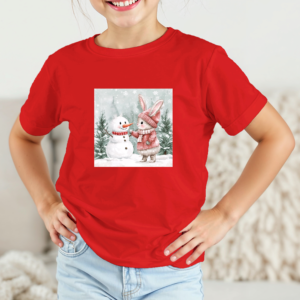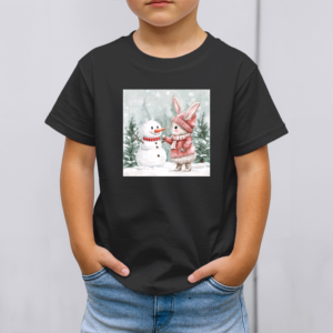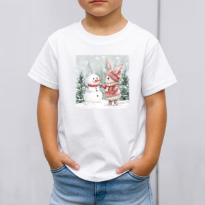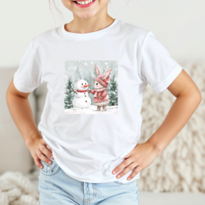 Vaikiški marškinėliai su spauda „Zuikutės ir sniego senio susitikimas“