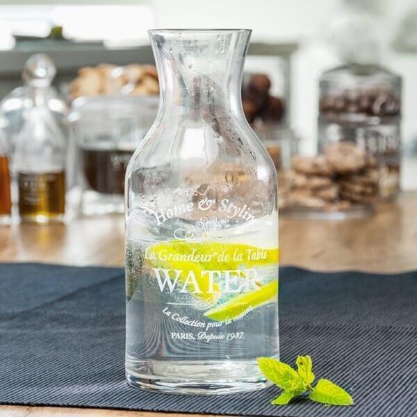 Stiklinis vandens grafinas dekoruotas baltu tekstu – puiki dovana kiekvienai šeimai ir kiekvieniems namams. Toks grafinas bus puiki dovana daugeliui progų, nes taps ne tik stalo puošmena, bet ir naudingu bei praktišku daiktu namuose. Šis grafinas yra apytiksliai 1,25 l talpos, o jo apytiksliai išmatavimai yra 10 x 24 cm.