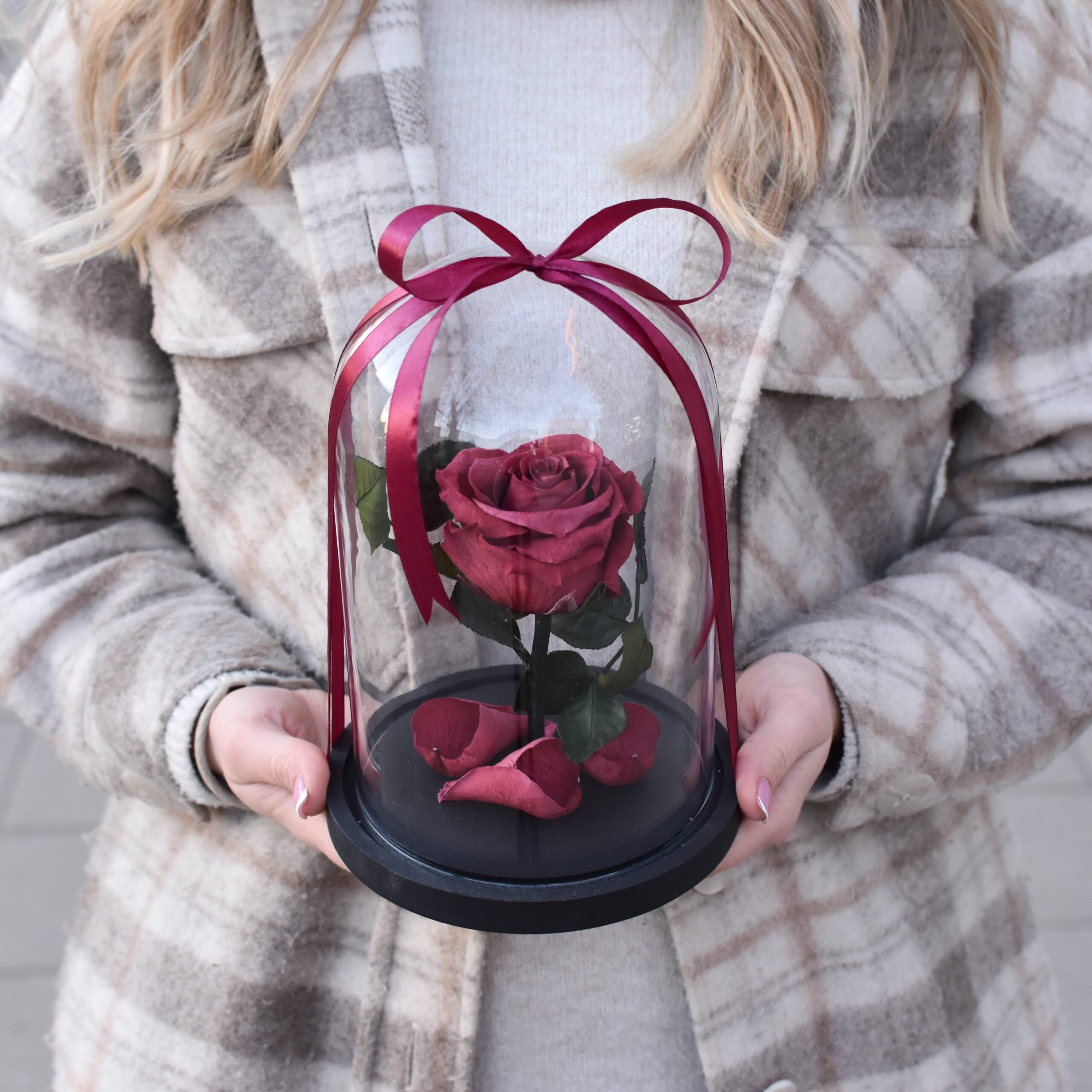 Norite padovanoti kažką neeilinio, padėkoti ar tiesiog pamatyti brangiausios šypseną veide? Nustebinkite artimuosius nebrangia, bet prabangia dovana, kuri laikysis ne vieną ir ne dvi savaites. Medinis stovelis, viena stabilizuota vyšninės spalvos gėlytė ir stiklinis kupolas, gaubiantis ją. Kaspinas parenkamas pagal gėlės žiedo spalvą. Juk džiuginti taip gera!